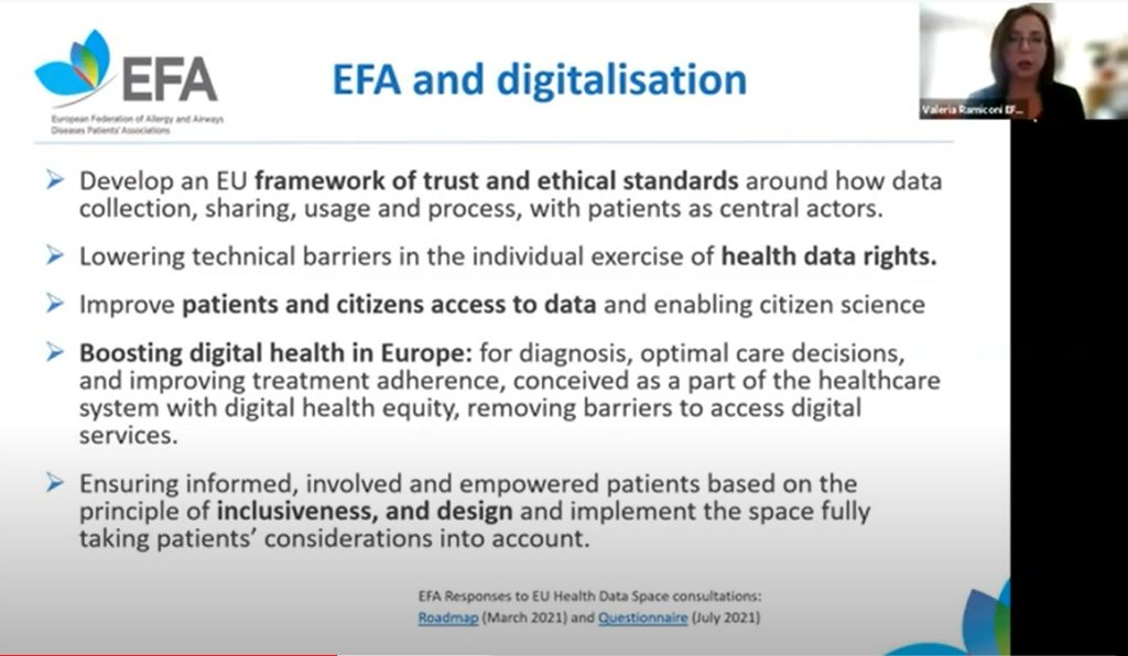 The results are a breakthrough which provide a clear picture of asthma and COPD patients’ digital health use and needs. EFA prepared a survey report to communicate the results and conducted several workshops with EFA Members to come up with policy recommendations stemming from the evidence gathered. The report, expected for the first half of 2022, will be EFA’s main positioning and advocacy tool to inform policymakers, healthcare professionals, industry and academia that will shape the future European Health Data Space regulation and its application.