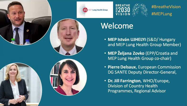 Its launch was warmly welcomed by Members of the European Parliament (MEPs) István Ujhelyi (S&D/Hungary), Željana Zovko (EPP/Croatia) and Sean Kelly (EPP/Ireland). The BREATHE Vision for 2030 was institutionalised by keynote speakers from the European Commission Directorate General for Health and Food Safety (DG SANTE), Deputy Director of DG SANTE, Mr Pierre Delsaux, and the Coordinator of the WHO European Office for Noncommunicable Diseases, Jill Farrington.