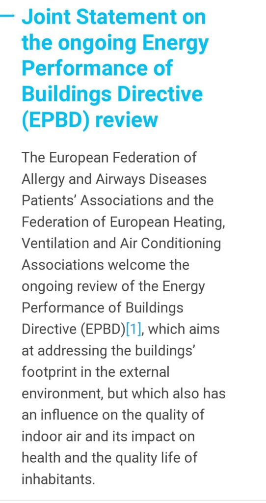 Throughout 2022, we continued highlighting the effects of indoor air pollution. Crucially, we informed the European Parliament on the revision of the Energy Performance of Buildings Directive (EPBD), with recommendations to the eight MEPs in the Industry, Research and Energy Committee (ITRE) involved in the discussions to better legislate IAQ. We also issued a joint statement with the Federation of European Heating, Ventilation and Air Conditioning Associations (REHVA) to include a clear definition of ventilation that relates to IAQ and to include IAQ indicators in the future Energy Performance Certificates (EPCs).