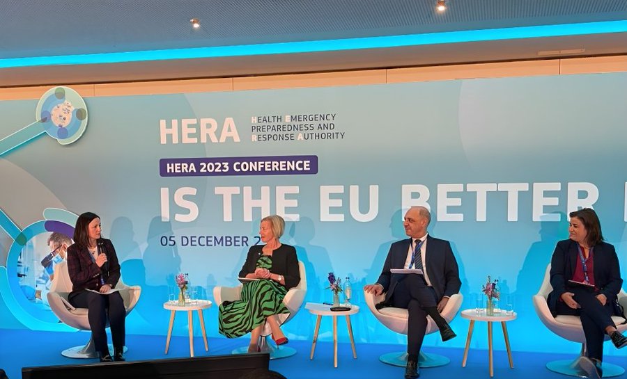 EFA’s Director of Policy and Communications Isabel Proaño (on the left) brought the patient to the HERA Conference session on ‘Ensuring the availability of critical medical countermeasures in Europe’ with EMA Executive Director Emer Cooke, Portuguese Minister of Health Manuel Pizarro, MEP Sara Cerdas (Portugal/S&D) and HERA Director General Laurent Muschel.